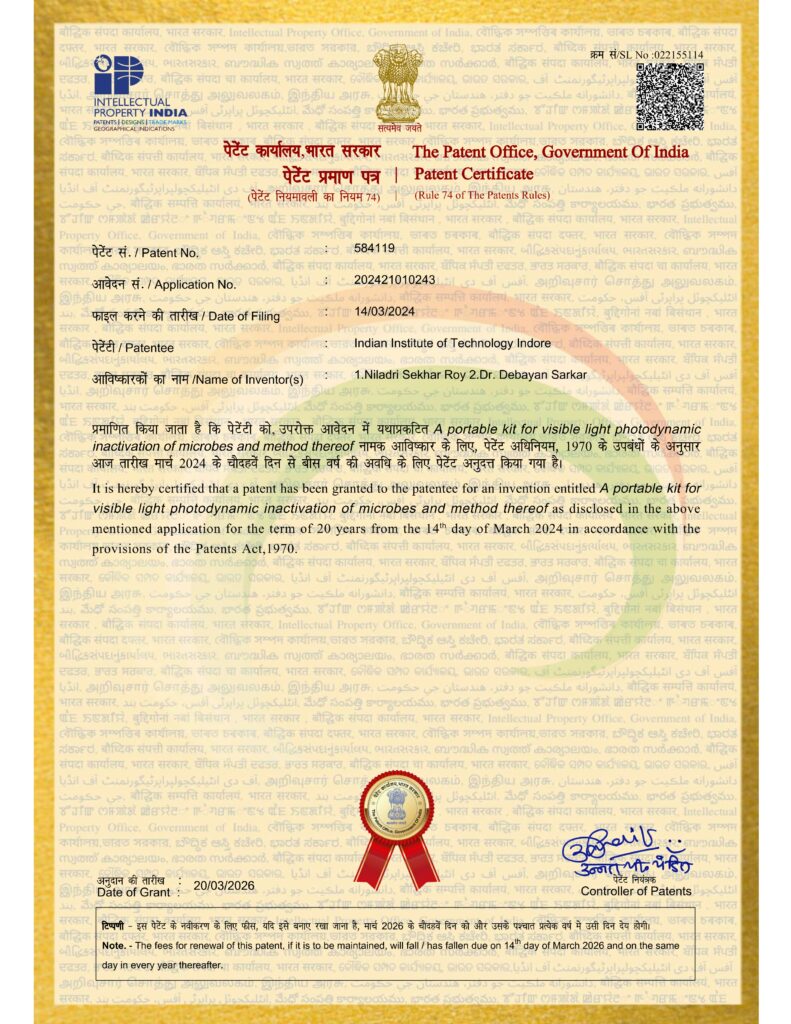 2. A portable kit for visible light photodynamic inactivation of microbes and method thereof, Granted on Date: 20-03-2026, Patent No. 584119